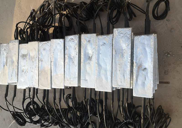 以上的鎂合金犧牲陽極也可以經(jīng)組裝后提供給客戶。裸陽極首先和電纜連接,連接部位 用環(huán)氧樹脂密封。然后加填充料封裝在棉布袋里。